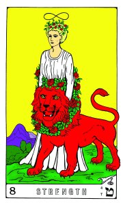 Tarot Keys 1-29-06 021 Strength #8Use your will to decide to meditate. Meditation then uses the powers of deduction and imagination to direct our sub-conscious mind. In Strength Isis tames the lion, the animal forces in the human personality, with ease and poise. The knowledge we acquire in meditation is gathered from the all encompassing memory of Mother Nature.