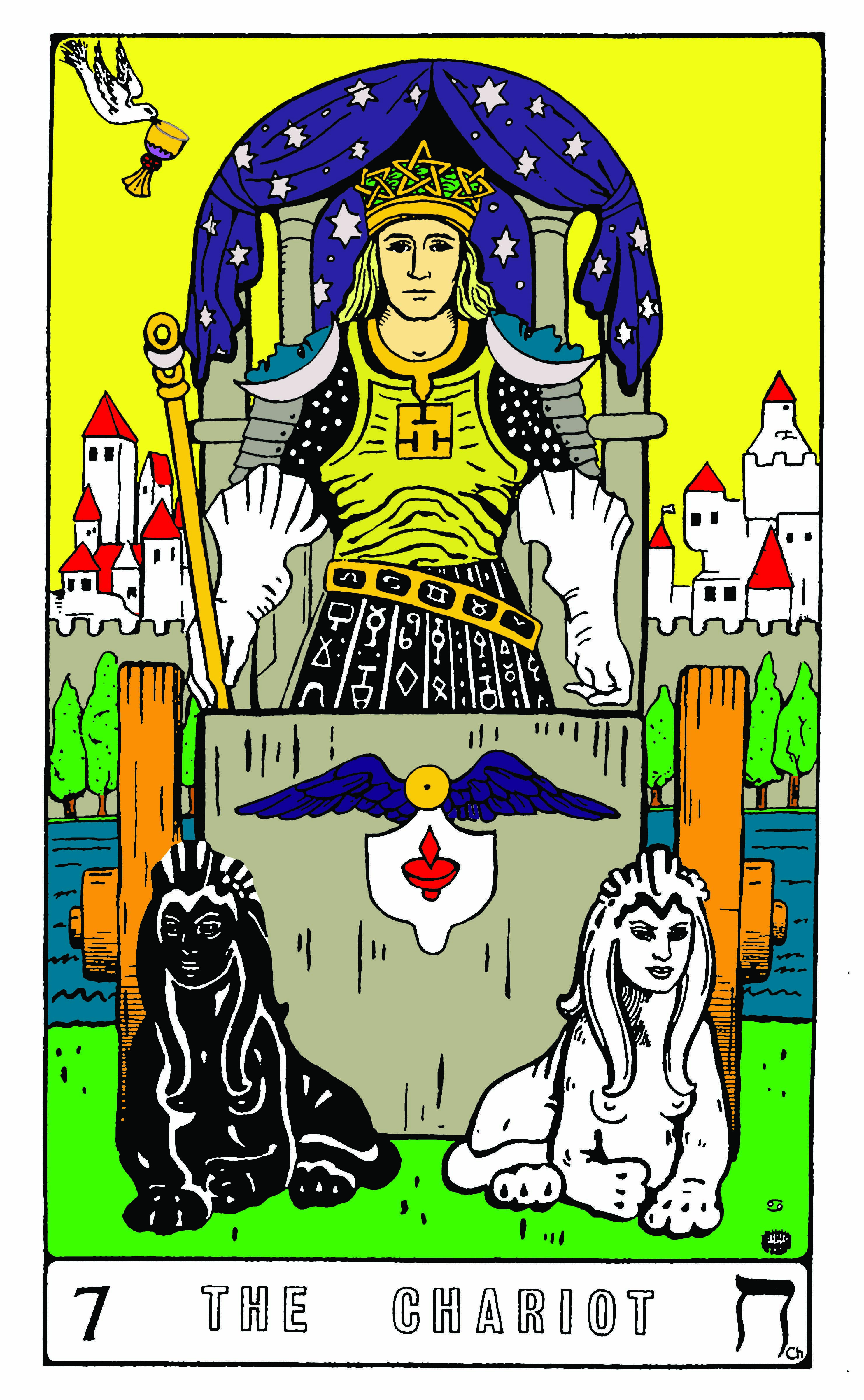 The words receptivity and will are attributed to Key 1. Receptivity was suggested by the Magician’s gesture, he holds the hollow wand up in his right hand signifying that our support comes from within. Key 7 is the reward for the Magician’s mental efforts. The Tarot looks upon the use of will as being an impersonal faculty. It is a living, motivating power behind the entire universe, which means that every person can access it on an equal basis. But it’s not a possession. We use this power based on our ability, which we have to develop.